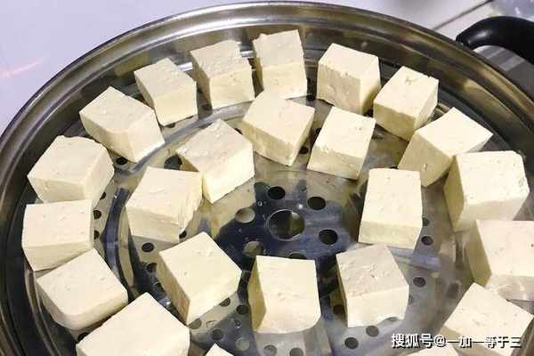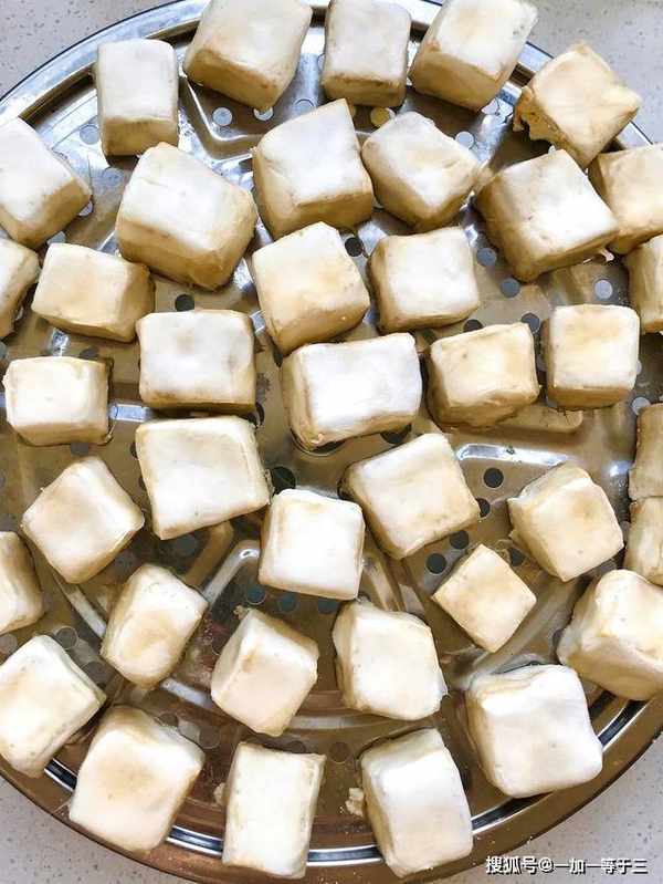 1、两斤北方老豆腐,比较结实硬块的这种,改刀切成2X2厘米小方块,水开上锅蒸5分钟,关火开盖,彻底放凉,计算好时间,别蒸过头了。