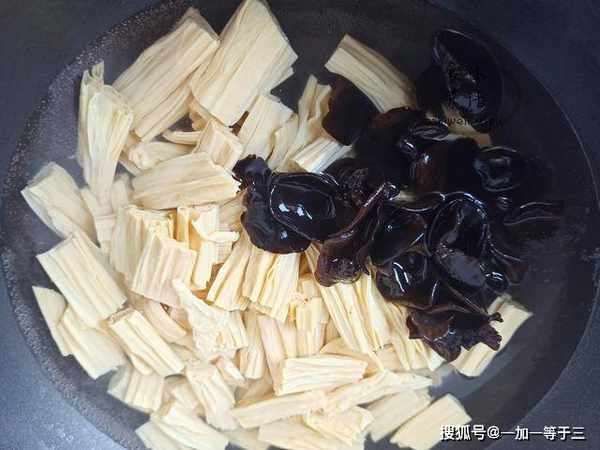 3、锅内烧开水,把腐竹和木耳倒进去,去掉一部分豆腥味,等水再次煮开,控干水分捞出。