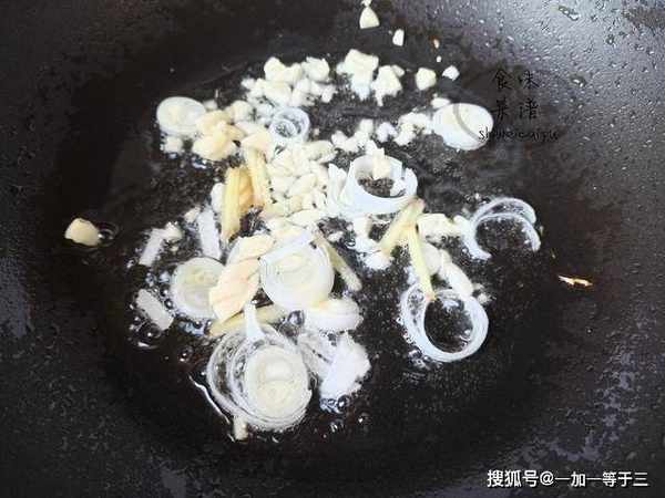 4、锅内烧油,放入葱花和姜丝,翻炒出香味。