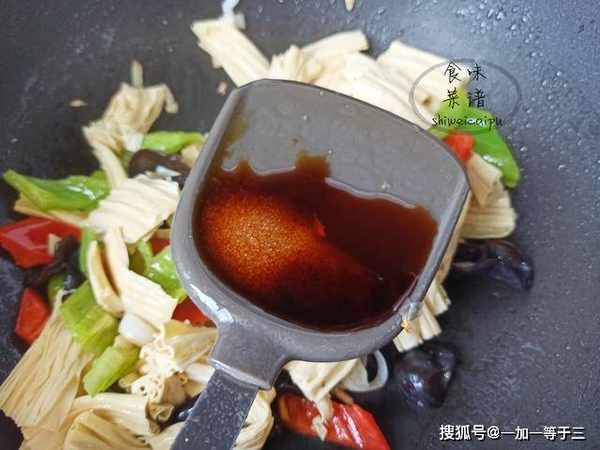 7、加点水淀粉勾芡,淀粉水会让腐竹更入味,单从口感上来说,特别好吃,如果有明油,可以加点明油,用来增香提色。