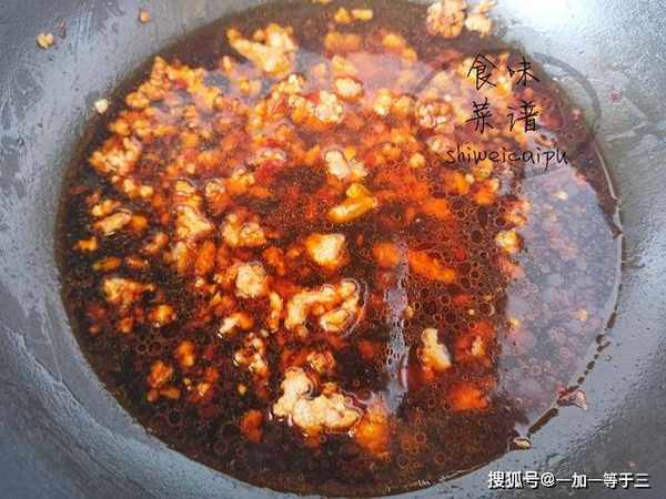 4、起锅烧油,等待油温6成热,先下入肉末翻炒,等颜色变白,再倒入葱姜末,翻炒出香味,加一勺豆瓣酱,炒出红油。