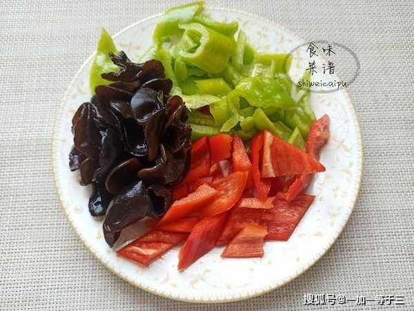 2、准备适量的辅料,有泡软的黑木耳,青红椒各半个,用来配色,如果爱吃辣,也可以用青辣椒代替。