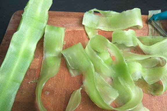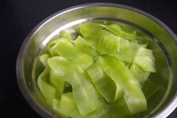 5、莴笋用刨皮刀,刨成长形莴笋片;