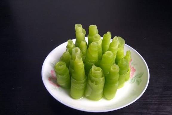 8、取一片莴笋,从一头卷至另一头;