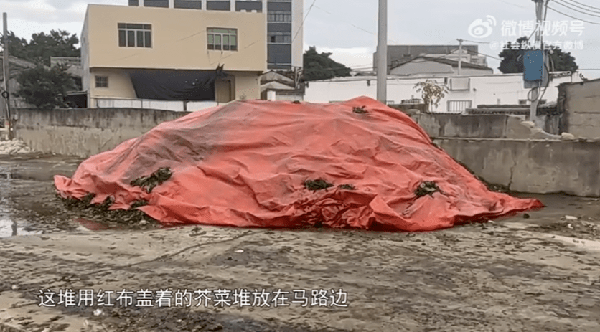 1月31日下午,当记者在汕头市龙湖区龙华街道南社村走访时,发现了一堆随意堆放在路边的芥菜,走近发现,这堆芥菜浸入泥水中,并已接近腐败,散发臭味。用木棍搅开,还可以看到一只只小的苍蝇,在芥菜上方盘旋!