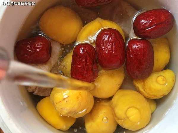 3、把猪骨头放入炖盅,板栗和红枣也一起放进去,倒入适量的清水。