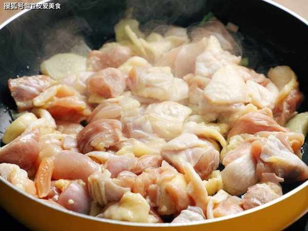 3、下入葱白、姜片、蒜爆香,下入鸡块,大火爆炒,炒至水分干,鸡油析出。
