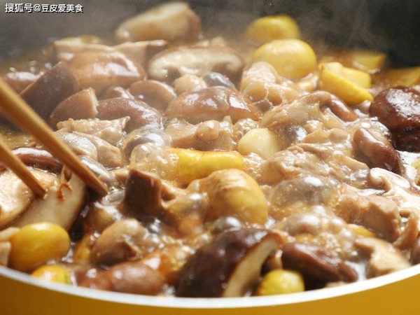 4、下入料酒、生抽、老抽和糖调味,翻炒均匀,下入香菇和板栗,再加入没过鸡块的清水,大火煮开,转中小火,焖煮20分钟。