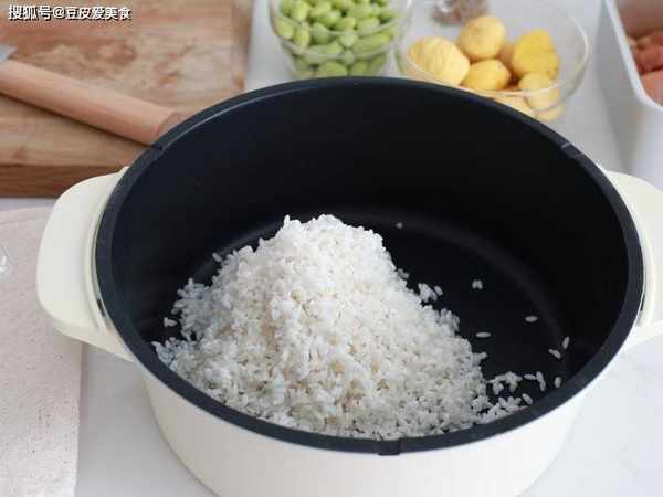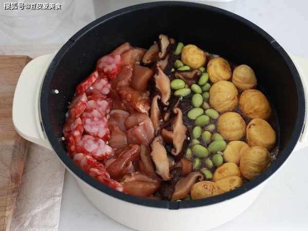 4、大米沥干水分,放入电饭煲里,在上面依次摆放上板栗,毛豆,香菇,鸡肉,香肠,倒入酱汁,没过食材,按煮饭键,开始煮。