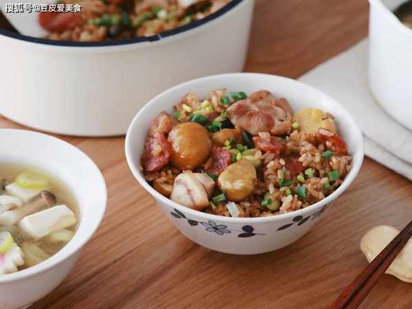 材料:板栗适量,干香菇适量,鸡胸肉适量,大米适量,香肠适量,毛豆适量。