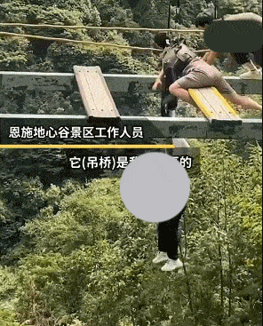 同一天,湖北恩施地心谷景区,一名十岁男孩在同样的项目上游玩时,不小心踩空,安全带脱离身体,摔下吊桥,腰椎、胸椎骨折。