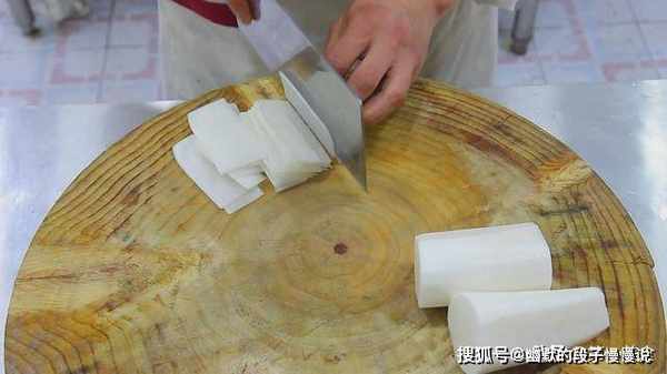 切片的时候先切下几刀把圆圆的白萝卜一面打平,把平的面放在案板上面,免得在切的时候萝卜会打滑,不小心切到手。