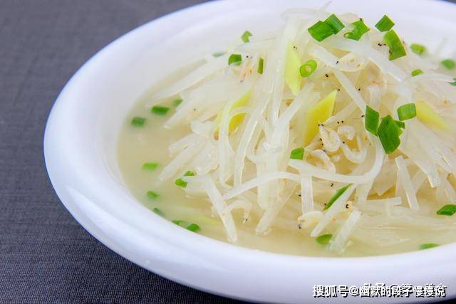 开小火,慢慢熬至汤汁变少,就可以出锅装盘了。最后撒上葱花点缀。好了,这道清淡美味的虾皮萝卜丝就做好了。这道菜不需要放什么调料,以清淡为主,汤的味道香而不腻。