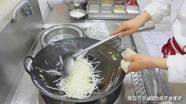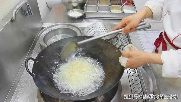 锅内烧油,倒入生姜,萝卜丝快速翻炒。