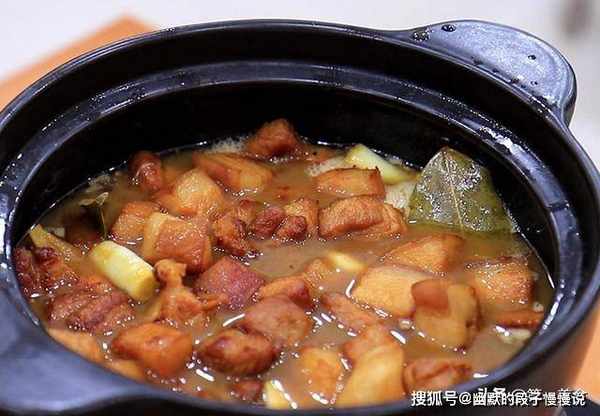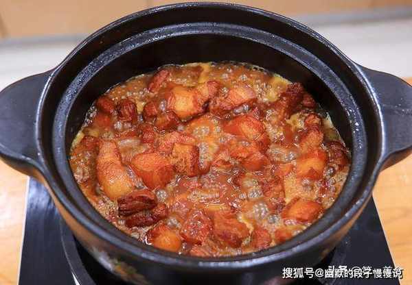 汤汁烧开以后把五花肉倒入砂锅中,大火烧开以后转小火炖30分钟,把五花肉炖熟、炖入味。