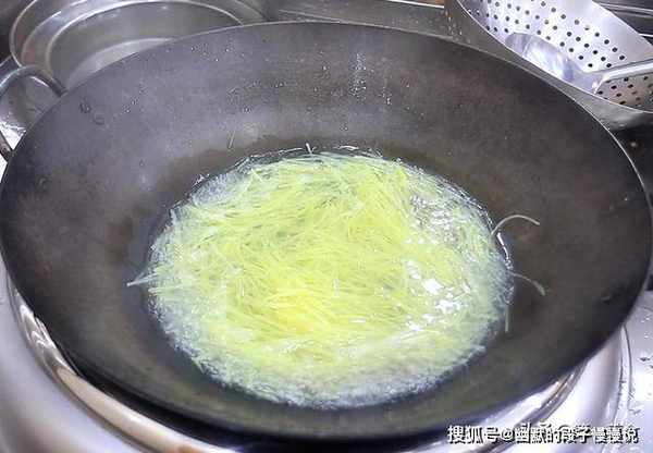 锅中水烧开以后,放入土豆丝焯烫30秒钟,土豆丝变色以后倒出来,快速放入凉水中过凉,这样吃起来更加清脆。