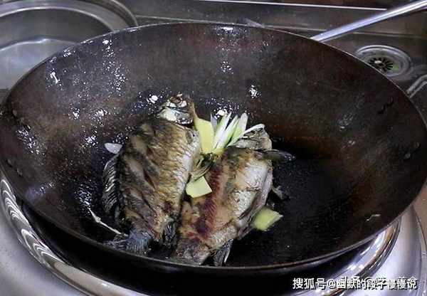 锅内烧油,充分滑锅以后倒出热油加入凉油,放入两勺食盐,食盐能防止鱼身和锅底直接接触,避免粘锅破皮,把鲫鱼放入锅中,保持小火煎3分钟左右,鱼皮煎成金黄色时颠锅翻面,把葱姜片放入锅中,继续煎至另一面也呈金黄色。