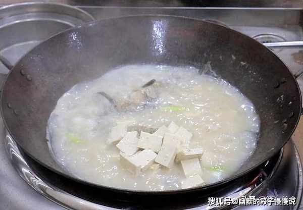 10分钟以后鱼汤已经炖成奶白色,把上面的浮沫打干净,把豆腐倒入锅中,盖上锅盖再炖8分钟。