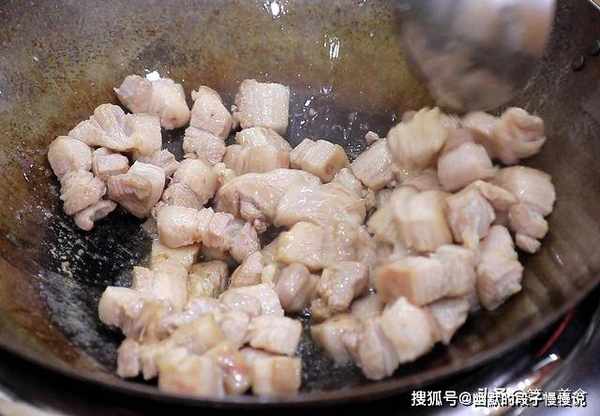 锅内烧油,充分滑锅以后倒出热油加入凉油,热锅凉油炒五花肉时不会粘锅,把五花肉倒入锅中进行煸炒,五花肉定型呈金黄色时倒出来控油。