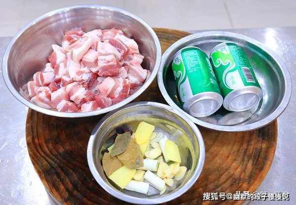 锅中留少许底油,放入半勺冰糖,把冰糖逐渐融化变色,变成红棕色时把五花肉倒入锅中,快速翻匀让五花肉均匀裹上糖色,倒入葱、姜蒜等小料一起翻炒,倒入两罐啤酒,啤酒能起到去腥增鲜的作用,加入生抽10克,食盐2克,少许白糖提鲜,鸡精2克搅拌化开调料。