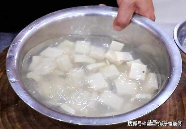 准备老豆腐一块,切成片放入清水中浸泡一会儿。
