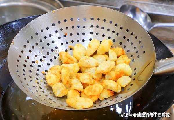 锅内烧油,在芋头上撒上一层淀粉,油温五成热时倒入芋头,开小火慢慢炸,芋头定型以后,用勺子轻轻地推动让它均匀受热,大约炸2分钟,芋头炸成金黄色,非常焦酥时捞出来控油。