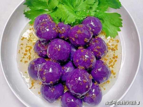 2、将芹菜叶摆放在盘子上,再摆上紫薯球,摆放成葡萄的形状。最后淋入桂花蜜即可上桌开吃。