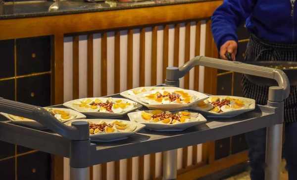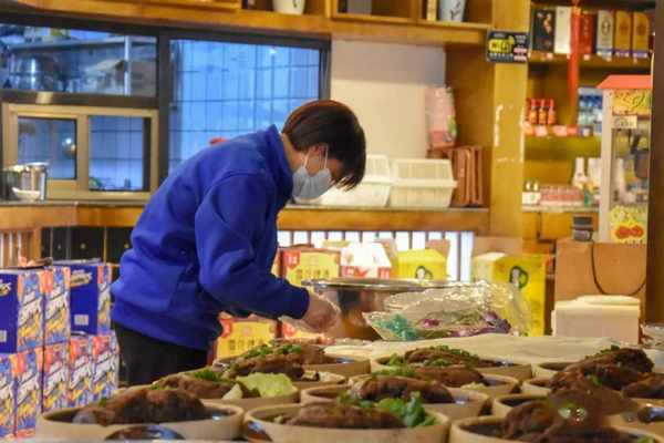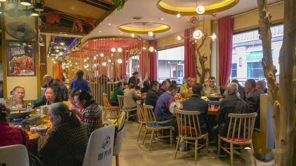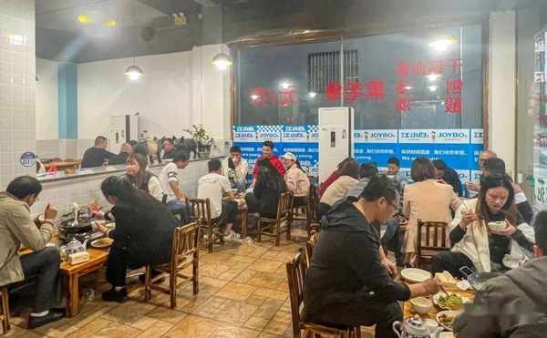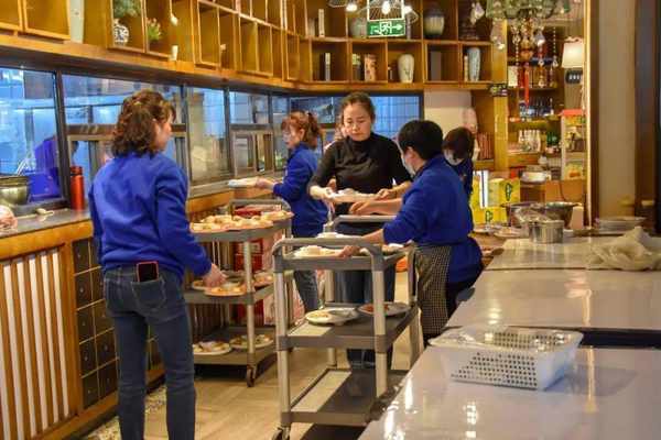 服务员 来回穿梭,忙碌地为顾客提供服务,堂食的喧闹声衬托了餐馆人气的火爆。