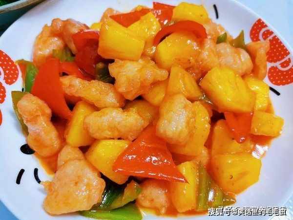 6. 锅中留底油,倒入菠萝翻炒一分钟,再把糖醋汁倒进来,煮至微微浓稠,放入里脊肉和青红辣椒,翻炒均匀,使每块肉都裹上糖醋汁。