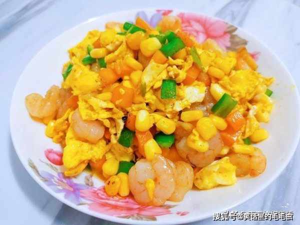 4. 起锅烧油,倒入姜丝和蒜片爆香,放入虾仁翻炒至变色,加入料酒翻炒几下去腥。倒入胡萝卜粒和玉米粒,加入生抽、蚝油调味,翻炒几下以后倒入鸡蛋,翻炒均匀即可出锅。