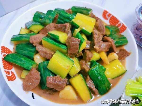 3. 牛肉炒出来的汤汁不用倒出来,直接放入黄瓜翻炒几下,然后把牛肉倒进来一起翻炒,加入一点点清水,盖上盖子焖煮一分钟。