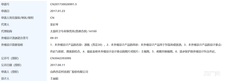 青花汾酒最早的一条专利信息显示为2017年1月(央广网发 截图来源:国家知识产权局官网)