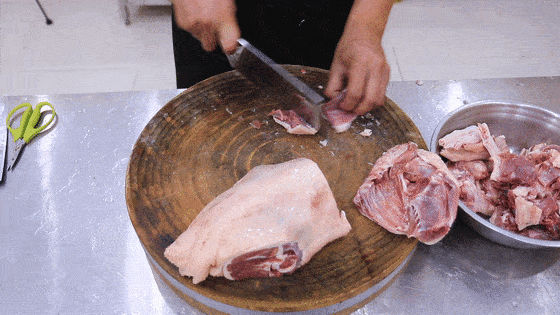锅内烧水,冷水放入鹅块进行焯水。焯水时倒入一点料酒去腥,并放入两勺食盐,慢慢煮出鹅块中的血渍。等水烧开以后,记得打去锅中的血沫。焯水时间大概在2分钟左右就可以了,之后把鹅块倒出来,用清水冲洗干净,沥干水分备用。