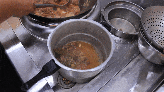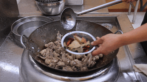 先添加清水没过鹅块,再加入食盐3克、胡椒粉2克、白糖少许提鲜以及生抽10克。之后把红曲米放入滤勺中,浸到汤水里面为鹅块上色,最后再加入蚝油10克增鲜。等大火烧开以后,取出红曲米,把鹅块倒入高压锅中,上汽以后转小火压10分钟。