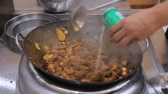 配料炒香以后,淋入一点老抽上色,把颜色炒均匀后,加入两勺辣妹子辣椒酱。等把酱料炒散炒香后,沿锅边倒入一罐啤酒,即能够增香又能去除异味。