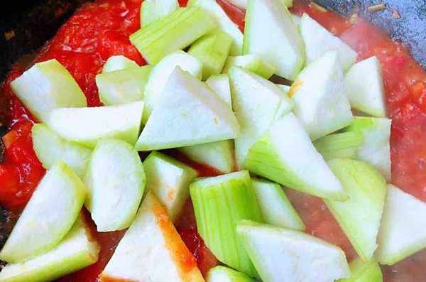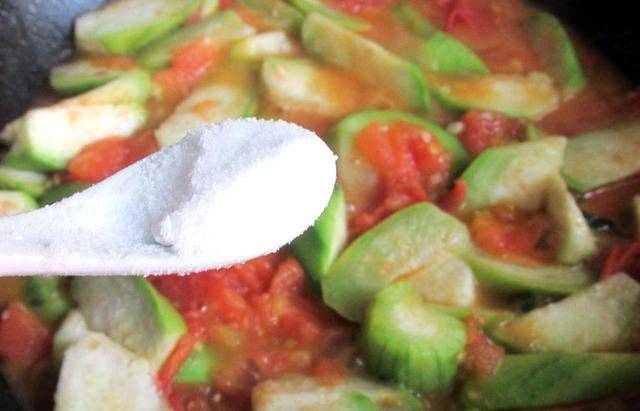 5、炒至番茄出浓汤后,倒入丝瓜拌匀翻炒至丝瓜断熟,撒上适量的盐,炒匀后熄火上桌。