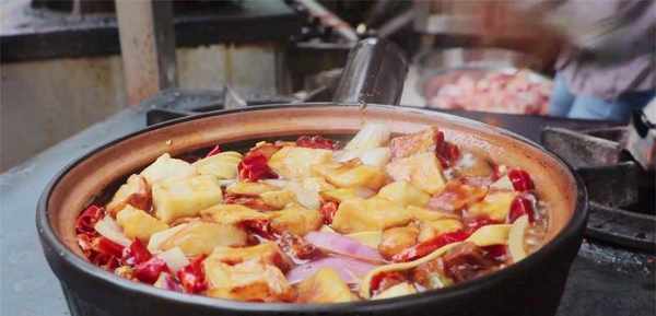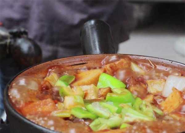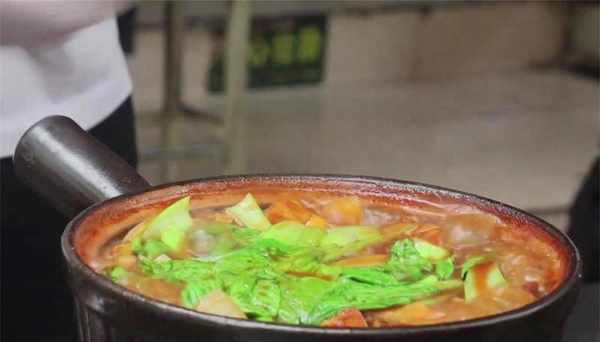 砂锅中的汤汁翻滚之后,再放入切好的干辣椒段、切好的洋葱颗粒、提前炸好的小土豆块、切好的青椒块、青菜等等配菜,一起继续焖煮3分钟左右,把所有的食材都煮熟煮透,就可以关火出锅了,热腾腾的,16元钱一碗,几年时间一直没有涨价,顾客还可以根据自己的喜好自费添加一起其他的配菜一起焖煮。