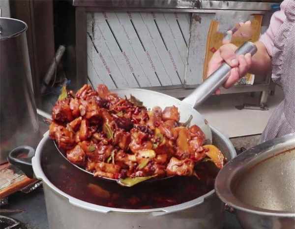 店里用的鸡肉都是当天清晨去市场采买回来的新鲜鸡腿肉,砍成小块,加上从四川本地进回来的花椒和辣子,加上本地的香叶、茴香、八角等香料一起焖煮好,捞出过滤掉汤汁备用。