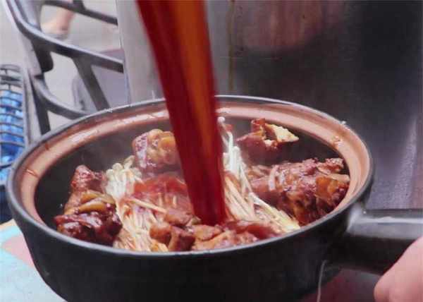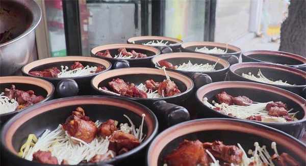 每次饭点时间都是8口砂锅同时煮,店门外还经常排着长队,这样做出来的砂锅鸡口味鲜香还带有麻辣,加上各种配菜,里边的食材还是很丰富的,都浸入了焖煮鸡肉的汤汁,很入味,麻辣香浓,特别的下饭。