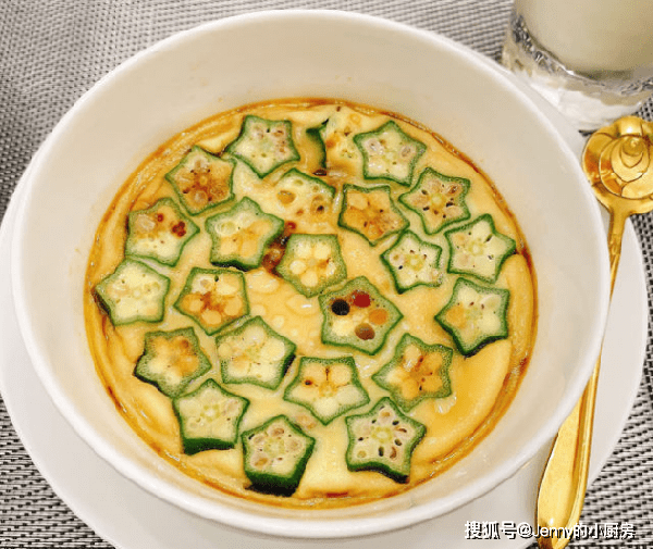 然后将蛋液表面的泡沫撇掉,再将蛋液转进蒸碗中,放入秋葵片。