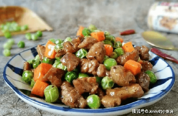 留底油倒入姜丝、蒜片爆香,再倒入豌豆、胡萝卜翻炒,炒到断生,也可以加水焖几分钟。