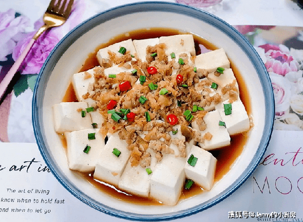 猪肉剁成肉末待用。豆腐冲洗一下,切成小块,放进深盘内摆好。