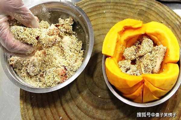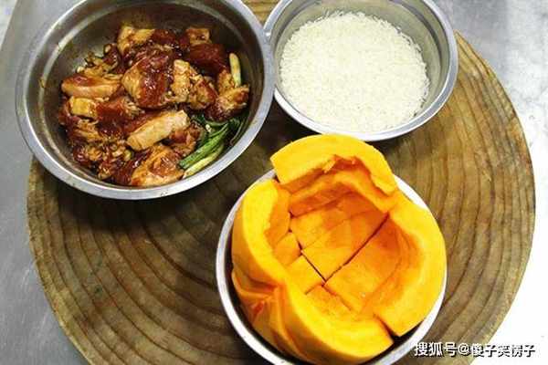 半个南瓜去皮后切成大块,摆放在盘中;五花肉切成小块加盐、鸡粉、胡椒粉、蚝油、料酒、老抽、旮旯角、八角、葱段抓拌均匀腌制15分钟;另外准备半碗长粒香米备用。