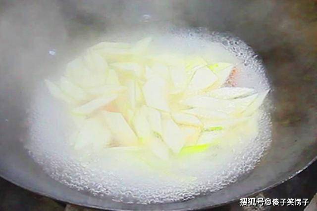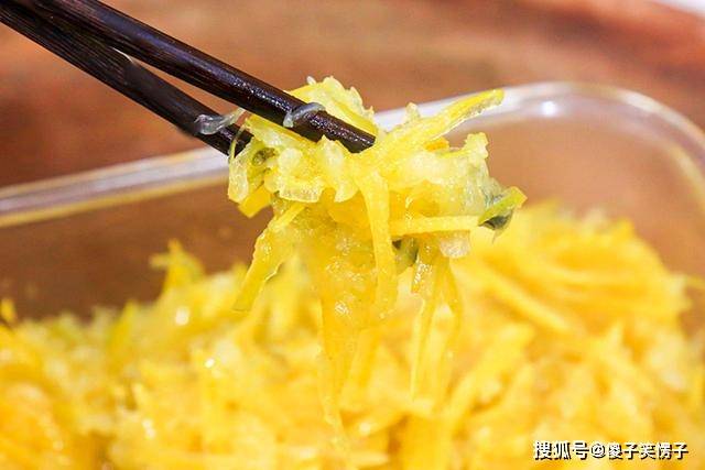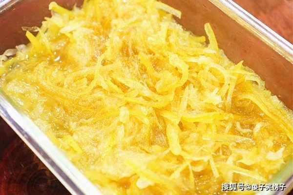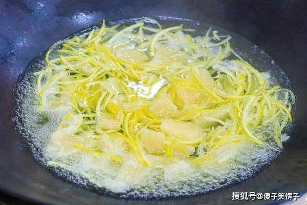 锅内烧水,把柚子皮放进去汆煮一下去除苦涩味,30秒钟捞出控水。