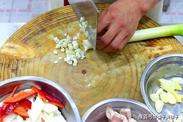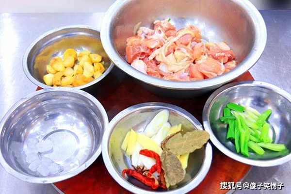 首先,把鸡腿浸泡洗干净、剁成小块,加盐、葱姜和料酒抓匀腌制30分钟;板栗去壳、只用果仁;蒜苗斜刀切成段;再切点葱段、姜片放入碗中,加入一片白芷、两粒八角、两片香叶、几个干辣椒;另外准备适量的冰糖备用。