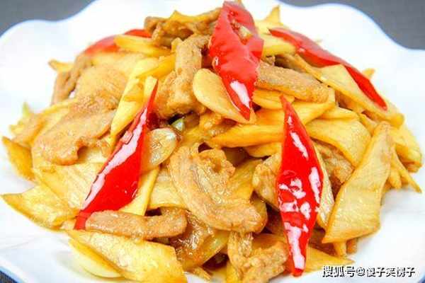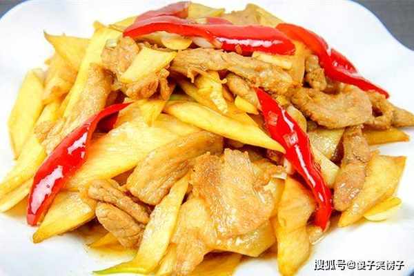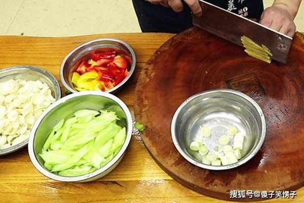 茭白去皮后洗净,切成菱形片;红椒去籽切成菱形片,用来搭配颜色;五花肉切成均匀薄片;再切点葱花、姜蒜片备用。