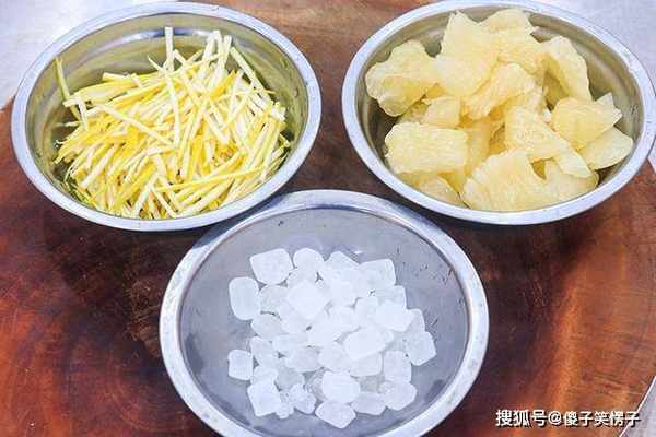 柚子洗净,把皮刮下来切成细丝;果肉剥出来掰成小块;再准备适量的冰糖备用。