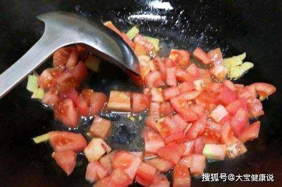 第四步:在平底锅中加热油。油烧开后,加入葱花和姜丝炒香,然后倒入西红柿。