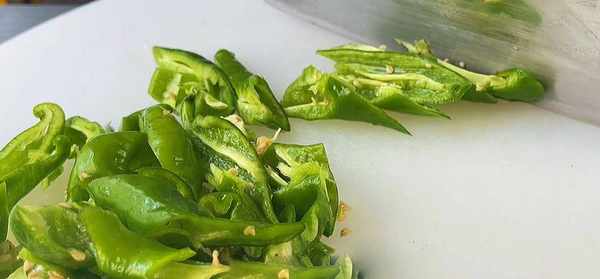 1、将新鲜的青椒洗净后去蒂,然后切成滚刀片。