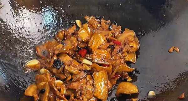 4、在起锅烧油,放入切好的五花肉片进行翻炒,将肉片炒香,炒出油脂之后放入拍好的生姜和大蒜,干豆豉及干辣椒段,同时加入适量蚝油,老抽进行翻炒,将肉片均匀的裹上颜色。